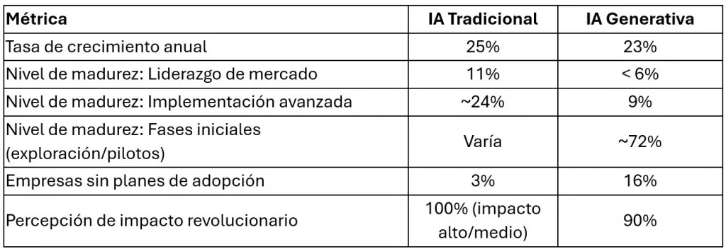 El panorama de la adopción de la Inteligencia Artificial se vuelve aún más claro al diferenciar entre la IA tradicional (análisis predictivo, machine learning) y la IA generativa (GenAI).